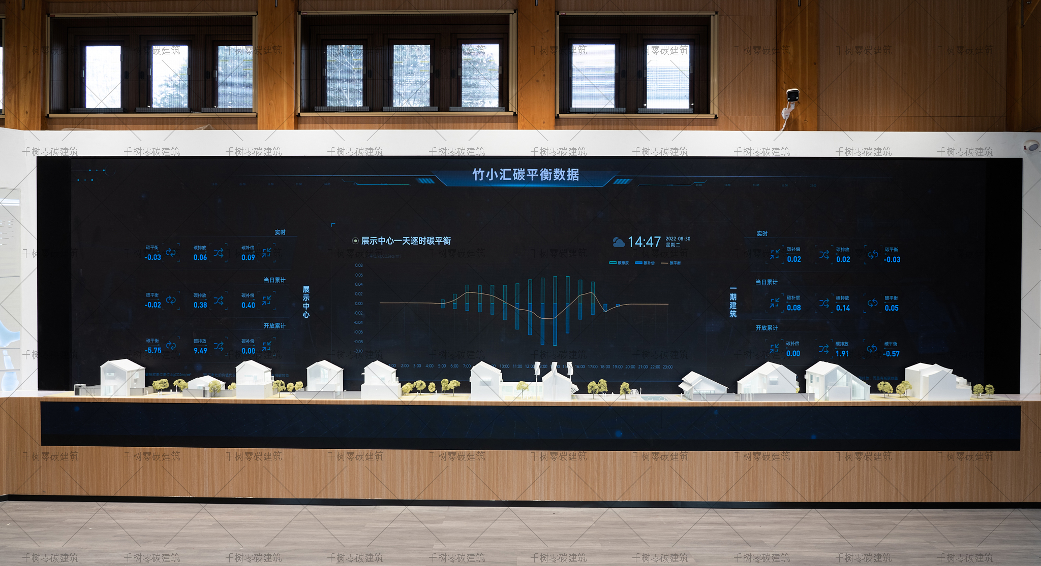 報告廳木屋和展示中心木屋墻面采用隔氣膜+內(nèi)外雙層保溫(內(nèi)保溫184mm厚,外保溫70mm厚)+CLT正交膠合木飾面板,屋面采用隔氣膜+保溫(屋面保溫235mm厚)+光伏瓦的圍護結(jié)構(gòu),門窗采用被動式節(jié)能阻燃木門窗(內(nèi)置遮陽百葉),加上高能效的技術(shù)設(shè)備:地源熱泵系統(tǒng)、風(fēng)力發(fā)電系統(tǒng)、建筑光伏一體化系統(tǒng)、光儲直柔系統(tǒng)、熱回收系統(tǒng),通過可視化的智慧運維管理平臺高效監(jiān)管、智慧運算,綜合管控與整治,最終實現(xiàn)了零碳建筑的目標。