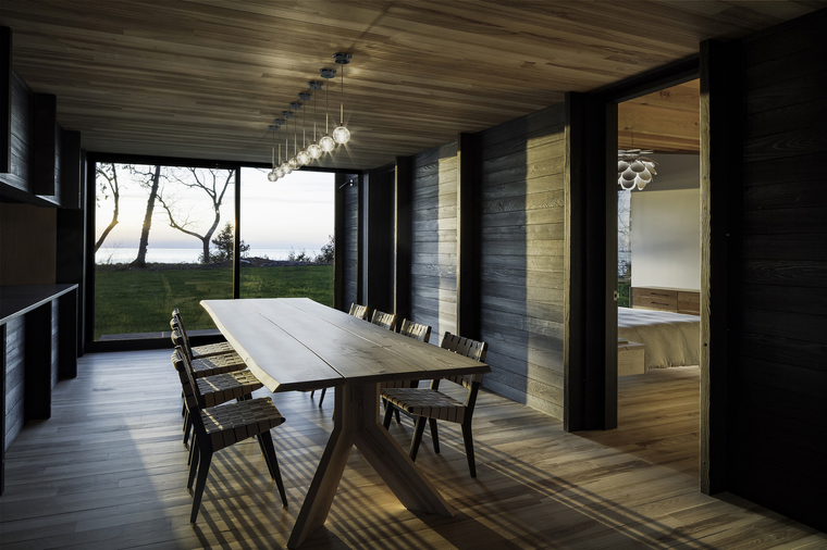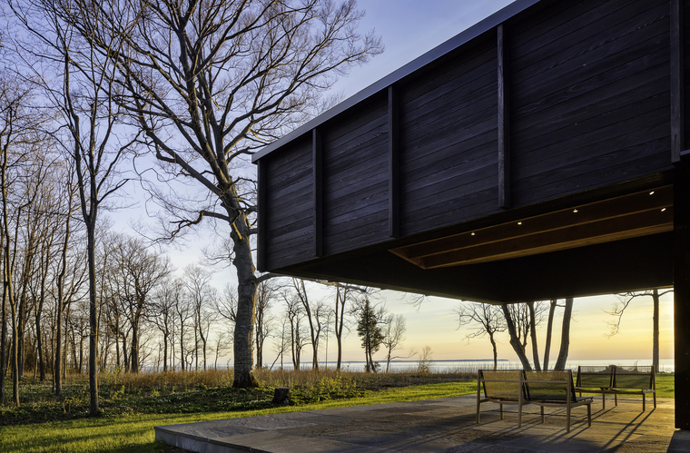暴露在外的木梁擺放位置使得整個(gè)室內(nèi)空間里的拱頂看起來并不對稱。在小木屋的南端,6米長的懸梁屋頂延伸至觀景休息平臺,屋頂為其提供了一種保護(hù),同時(shí)對密歇根湖和周圍的美景一覽無余。