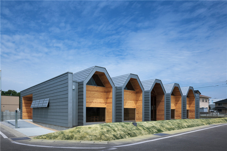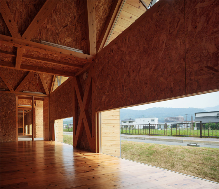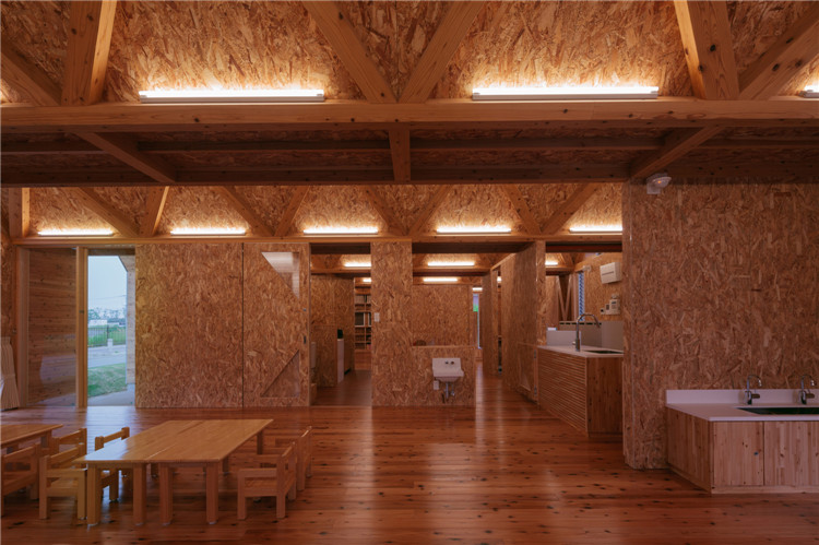本案托兒所位于福岡市附近的太宰府市,為了容納更多的孩子,不得不增加為兩個(gè)班級??紤]到日本全國范圍的出生率下降,不久的將來這里的孩子數(shù)量可能會減少,因此建筑師決定建造一座只有一室空間(9米跨度)的建筑,內(nèi)部沒有支柱,方便各種用途(游戲室等)的轉(zhuǎn)換。木桁架梁在工廠安裝,用拖車運(yùn)送到施工現(xiàn)場。復(fù)雜的連接也是在工廠制作的,只有一個(gè)相對容易的連接在現(xiàn)場組裝。這樣的方式提高了施工精度,縮短了施工工期。