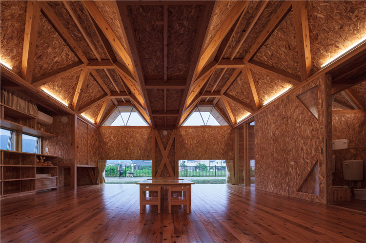 屋頂結(jié)構(gòu)采用折疊板設(shè)計(jì),無柱空間是通過運(yùn)用木桁架梁屋頂結(jié)構(gòu)實(shí)現(xiàn)的,形狀像一塊折疊板。所有支撐屋頂結(jié)構(gòu)的承重墻都被布置在建筑外圍?,F(xiàn)在這座建筑分成了兩個(gè)保育室、衛(wèi)生間等,但將來也可以轉(zhuǎn)換為一個(gè)大房間。