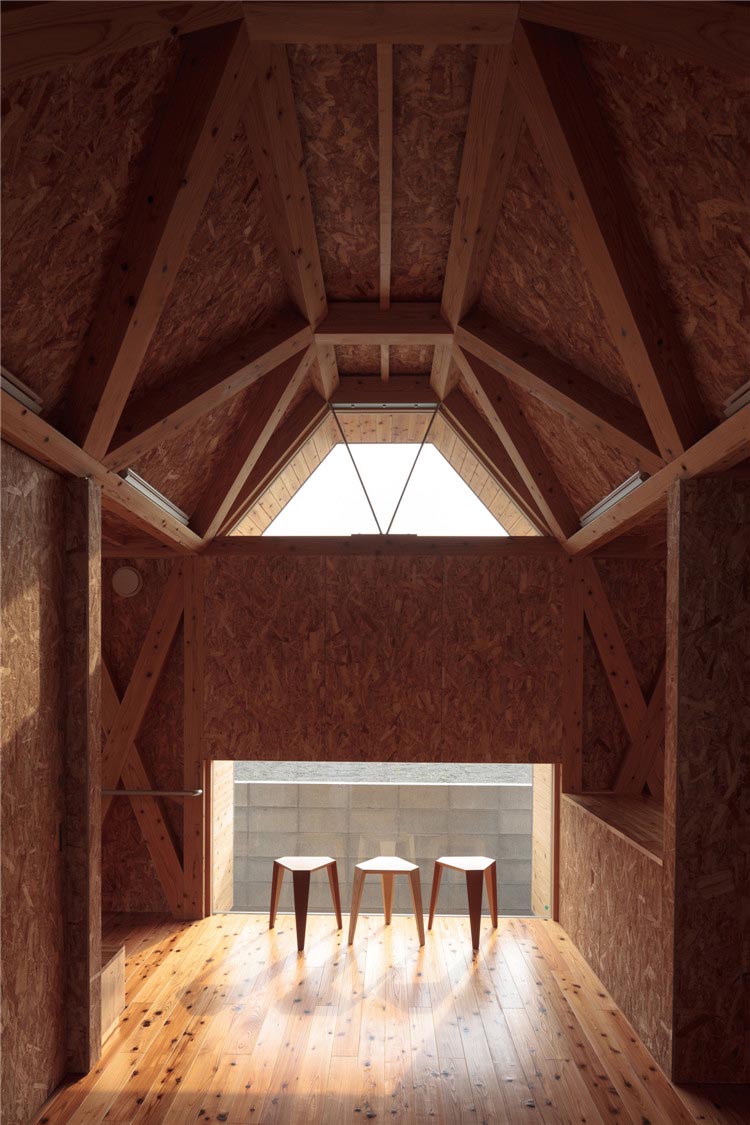 建筑的所有結(jié)構(gòu)不是天花板就是墻體,木桁架梁傾斜設(shè)置,是屋頂?shù)幕A(chǔ)結(jié)構(gòu)木構(gòu)件。這樣的設(shè)計(jì)滿足了客戶對于“保育室被木頭包圍”的要求,減少了建設(shè)成本。此外,通過降低天花板的高度,木材長度被縮短了,對空調(diào)的需求也降低了。由于天花板幾何形狀不規(guī)則且窗戶為梯形,因此雖然天花板最低的地方只有2.2m左右,但即使是成年人也不會感到壓抑。
