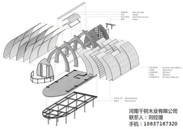 拱形的船身結(jié)構(gòu),由四組三鉸拱木拱梁通過五根圓木連接為整體,每組三鉸拱由左右兩個對稱半拱吊裝拼接,而每個半拱又由兩道十一公分寬的北美花旗松膠合拱梁組合成,拱頂?shù)男〗徊嬲鎸嵎磻?yīng)拱結(jié)構(gòu)的對接特征。采用三鉸拱的形式,避免了木材因過度彎曲而產(chǎn)生超限的應(yīng)力。整個屋面系統(tǒng)保持在拱梁的厚度之中,內(nèi)部紅雪松掛板使用水性清漆保持原木紋理和觸感,外部使用了三種尺寸的紅雪松木瓦上下微錯的鋪裝方式,質(zhì)感自然。