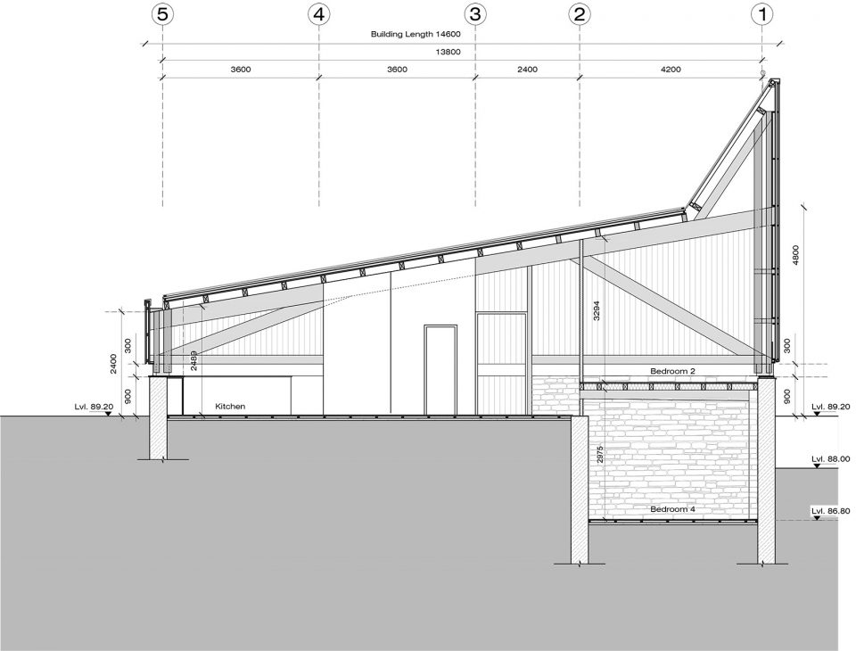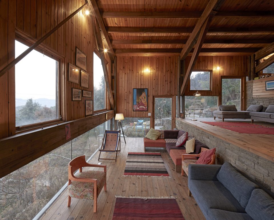 空間由三個不同的層次組成,每一個都大約占用14.5米x3.6 m的自然地形,外立面的連續(xù)橫窗使得周圍的果園和Almora鎮(zhèn)的壯觀景色一覽無余。這個開窗像是一個裂縫,成為現(xiàn)場挖出的裸露的干石墻基地和當(dāng)?shù)孛麨閠hun木材包覆之間的過渡。