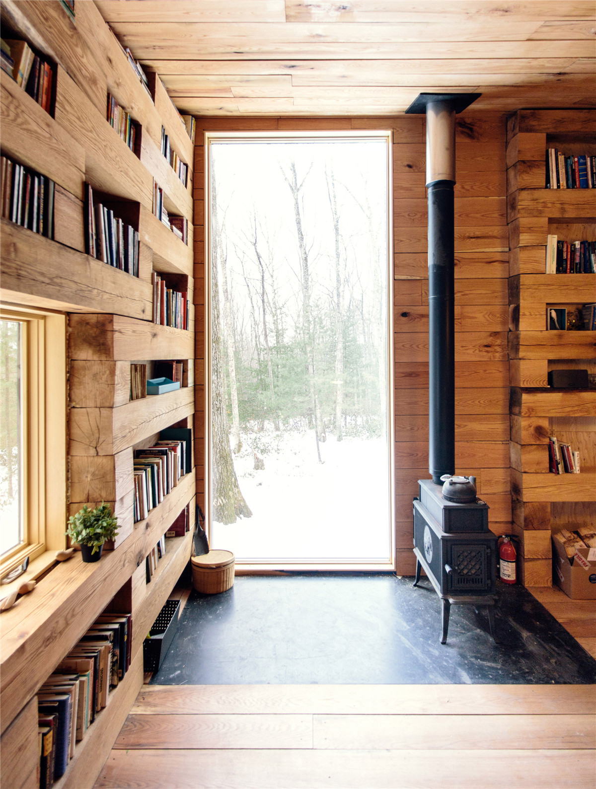 水平放置的木條一個(gè)接一個(gè)豎向堆疊,構(gòu)成了小屋的墻壁。它們之間的縫隙變成了書架,更大的開口就成了窗戶。