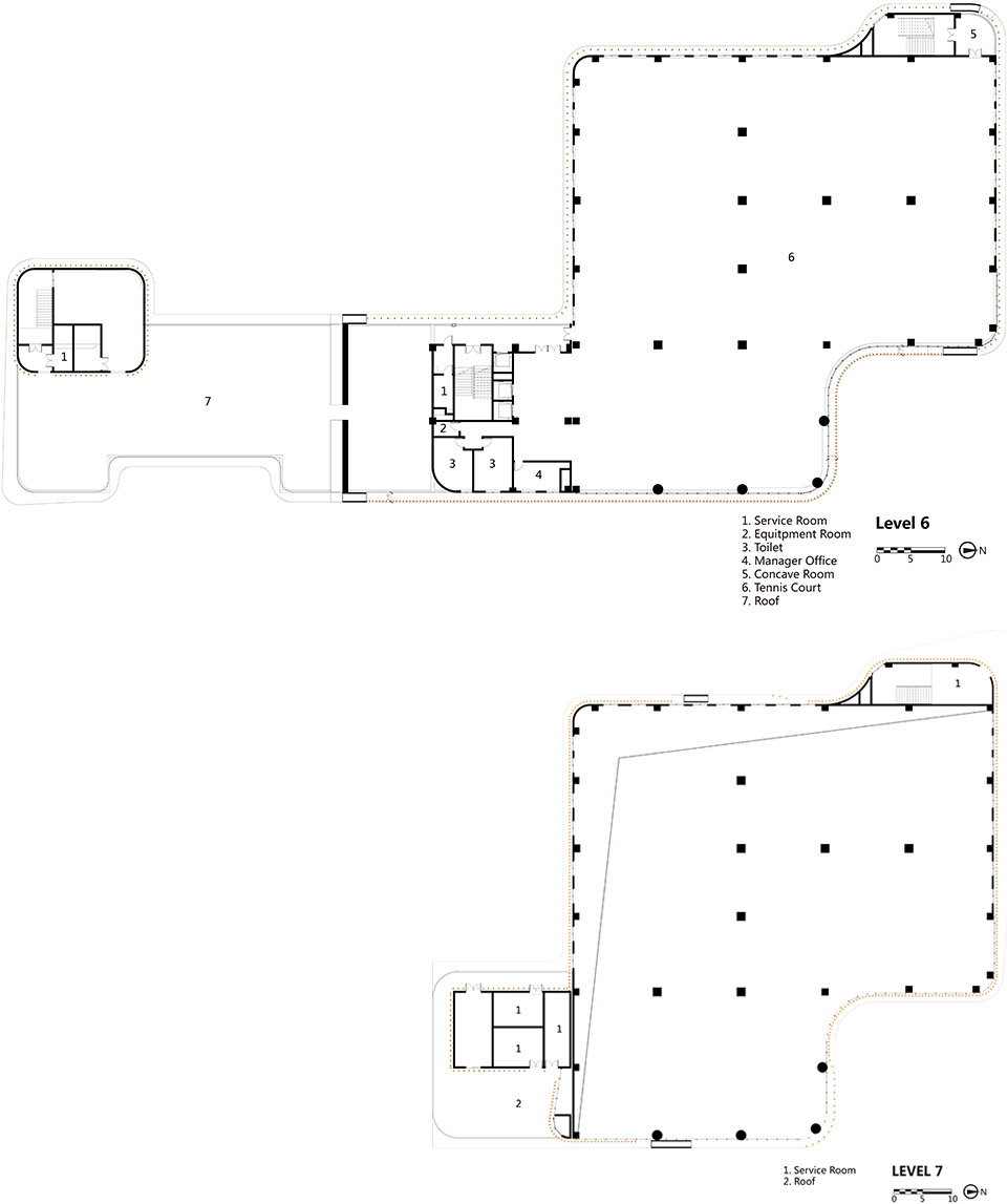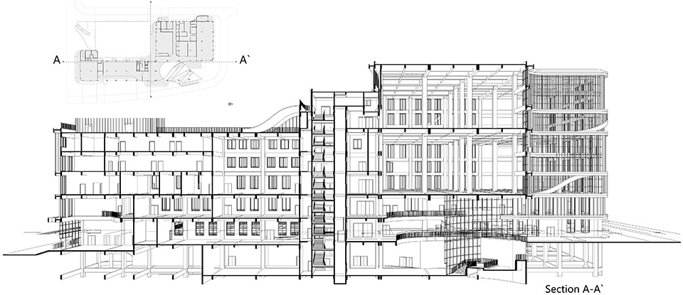 我們希望通過(guò)這個(gè)項(xiàng)目喚起我們的父輩及下一代的歸宿感。農(nóng)業(yè)生產(chǎn)是那個(gè)時(shí)代“集體式生活”的標(biāo)志,自然地貌便是這一代人集體記憶的背景。我們通過(guò)對(duì)建筑空間在“地面”層面上的疊加,再現(xiàn)了自然地貌:在城市層面上,由于本項(xiàng)目地處城市擴(kuò)張的邊界,位于較低的洼地地形,面鄰一個(gè)保留的綠化高地,我們?cè)诮ㄖ址ㄉ弦胍幌盗猩舷洛e(cuò)開的水平樓板來(lái)使這兩種極端的地貌形成空間上的對(duì)話;在建筑尺度,我們轉(zhuǎn)譯了這種拓?fù)潢P(guān)系為一種多層樓板的空間類型,例如地下室空間轉(zhuǎn)折到首層入口層,接著又垂直延伸到二層空間,并不斷交錯(cuò)向上;在細(xì)部層面,我們使用了木紋鋁方通遮陽(yáng)板系統(tǒng)將豐富的地景引入到室內(nèi),是對(duì)本土的竹材結(jié)構(gòu)建筑形制所做出的回應(yīng)。