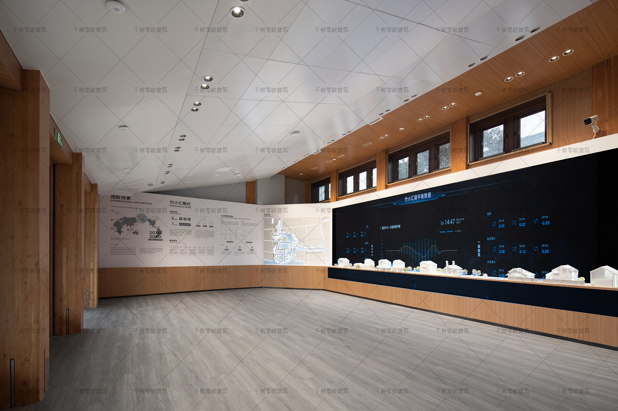 報告廳木屋和展示中心木屋墻面采用隔氣膜+內(nèi)外雙層保溫(內(nèi)保溫184mm厚,外保溫70mm厚)+CLT正交膠合木飾面板,屋面采用隔氣膜+保溫(屋面保溫235mm厚)+光伏瓦的圍護(hù)結(jié)構(gòu),門窗采用被動式節(jié)能阻燃木門窗(內(nèi)置遮陽百葉),加上高能效的技術(shù)設(shè)備:地源熱泵系統(tǒng)、風(fēng)力發(fā)電系統(tǒng)、建筑光伏一體化系統(tǒng)、光儲直柔系統(tǒng)、熱回收系統(tǒng),通過可視化的智慧運(yùn)維管理平臺高效監(jiān)管、智慧運(yùn)算,綜合管控與整治,最終實(shí)現(xiàn)了零碳建筑的目標(biāo)。
