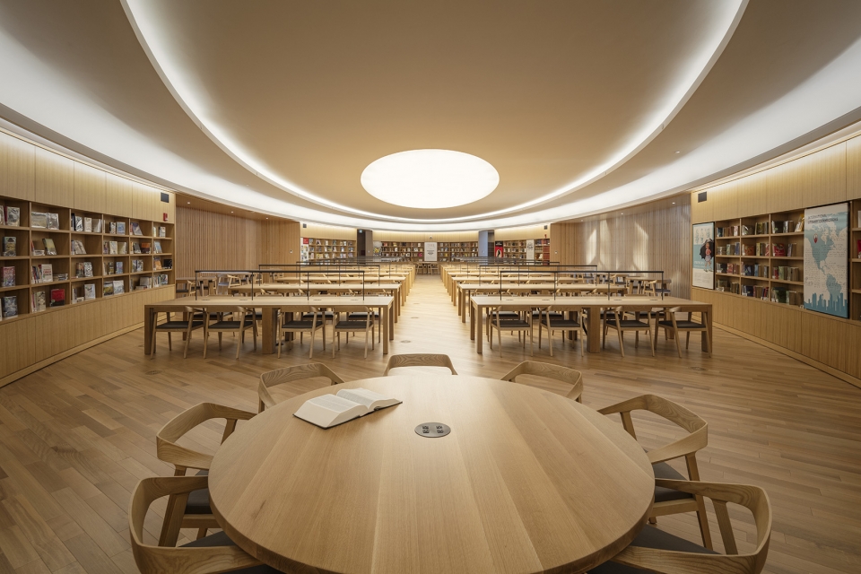 沿著拱門繼續(xù)走就走到了大廳和中庭,木質樓梯蜿蜒而上,最高處距離地面有85英尺,通過巨大的“天眼”可以看到天空的景象。木質格柵沿著開放式中庭的邊緣排列,從平面上看像是一個尖尖的橢圓,這樣布置可以讓人們能很快就明白圖書館的組織流線。圖書館內(nèi)部使用的混凝土是外露的,且不加任何修飾,隱喻著室內(nèi)空間的自由性。梁和柱的排列方式讓人聯(lián)想到古希臘建筑中用來聚會和知識交流的拱廊。保留材料的原始性,就是為了讓人們感覺到這個圖書館是一個大家能夠參與進來的地方,而不是一個神圣的藏書閣。