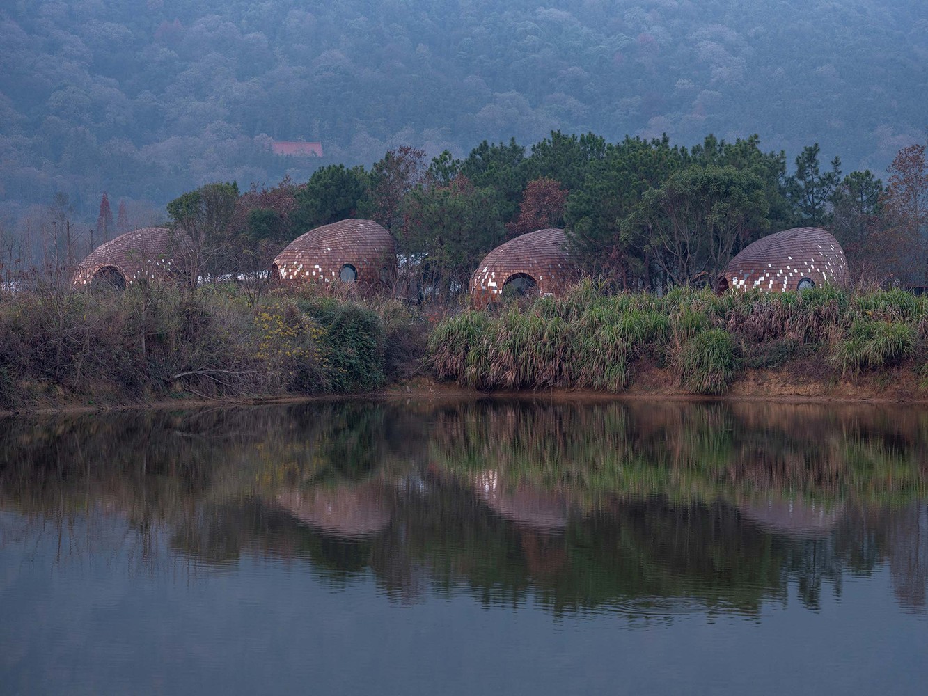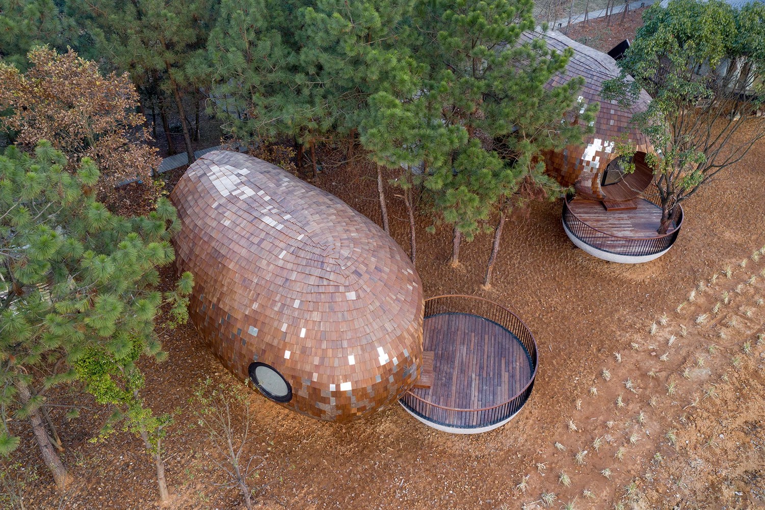 種子木屋整體呈橢球形,底部采用鏡面鋁板,往高處漸變?yōu)槟就?。鏡面鋁板隨著季節(jié)、天氣的變化,反射周圍的環(huán)境和氛圍,冬季時是紅土地,春夏季時是綠植,潮濕時是氤氳霧氣,晴天時是明媚陽光。鏡面鋁板是種子屋落地生根的部分,上部的木瓦則使建筑逐漸回歸自然柔和的本質(zhì)。