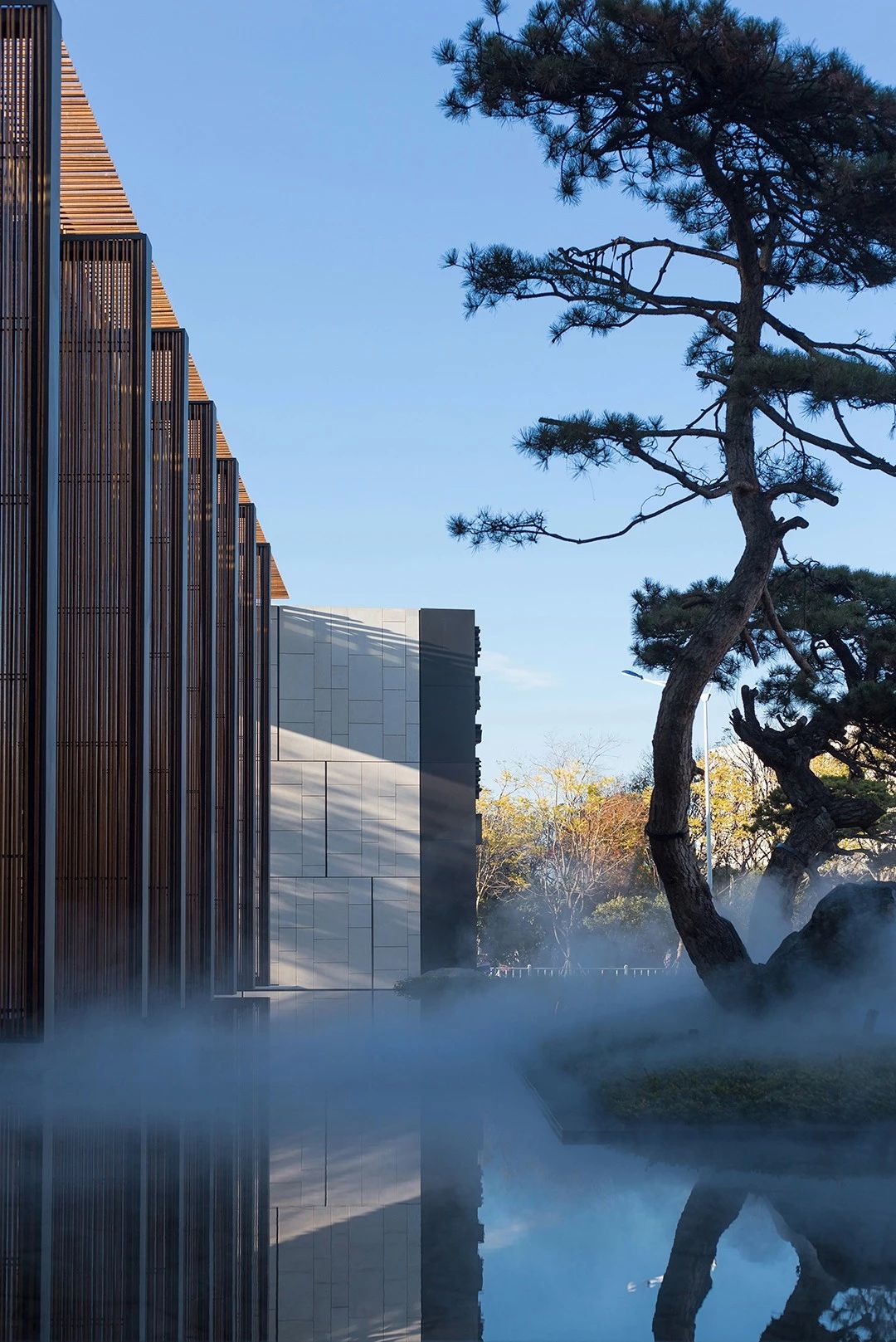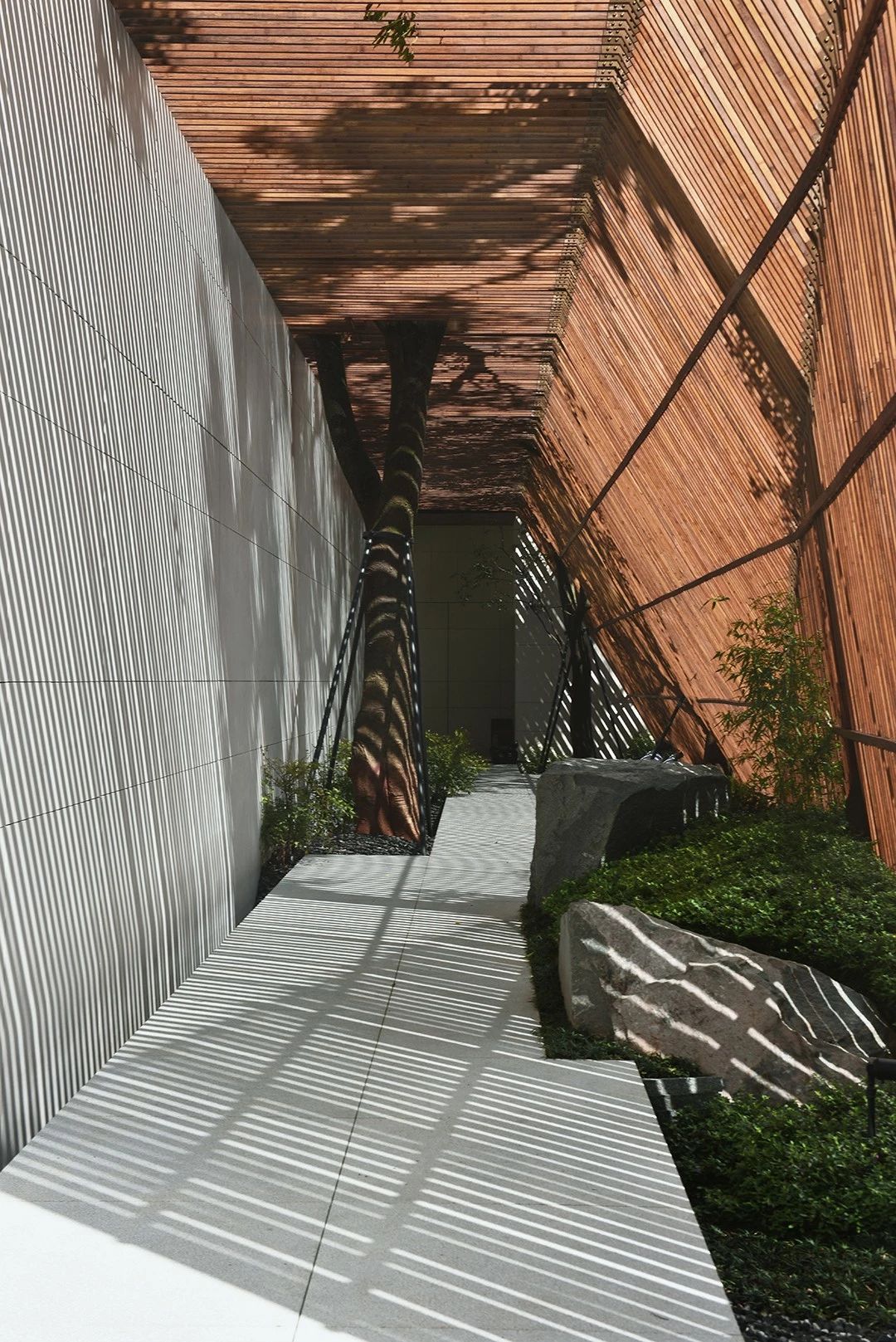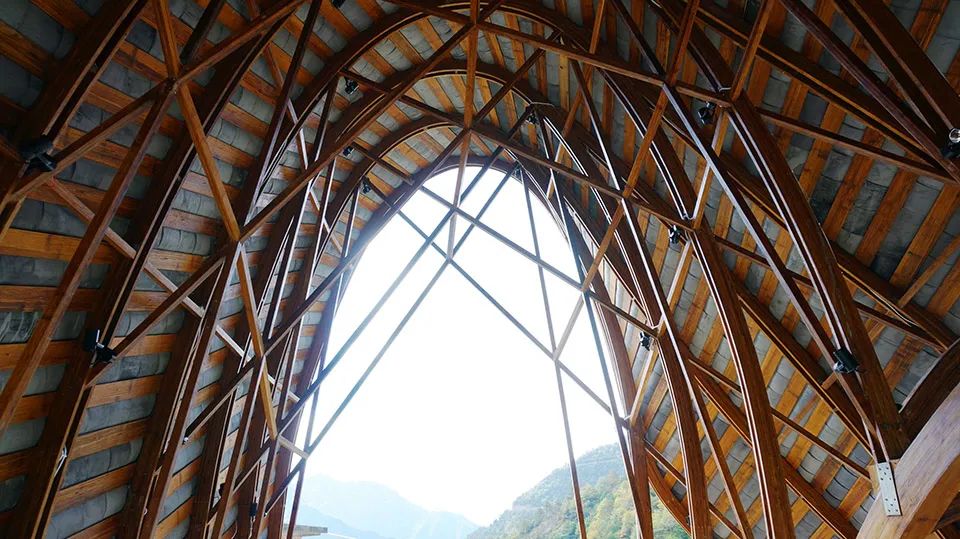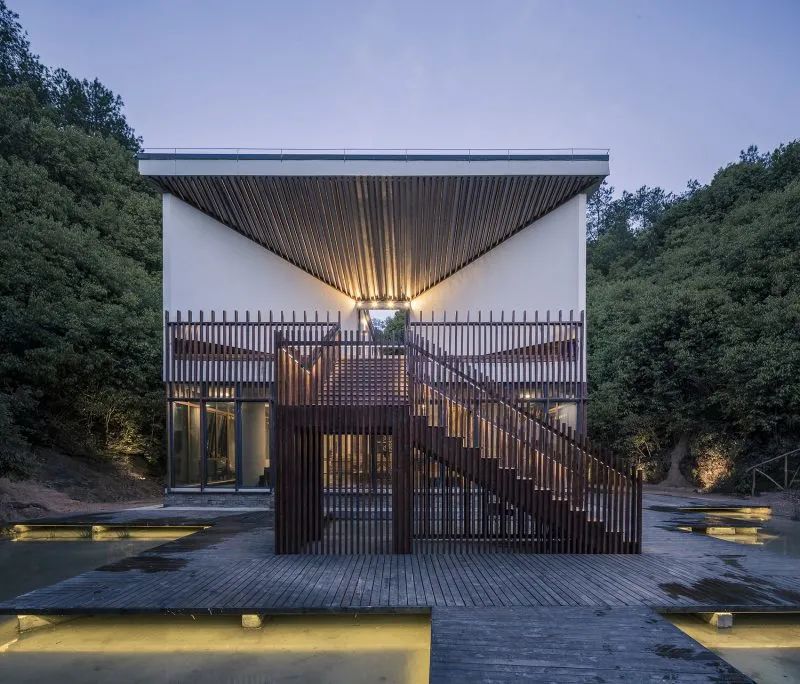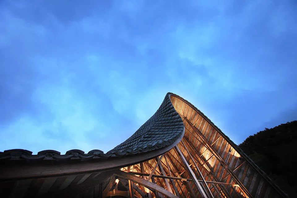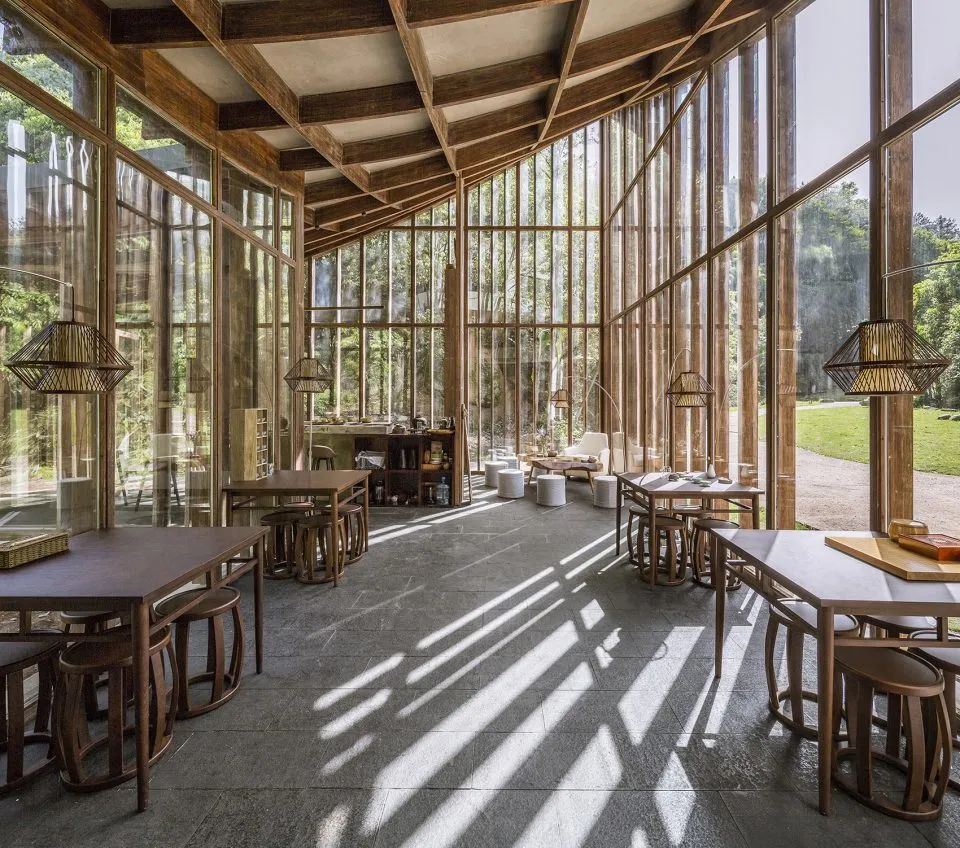 曲面屋頂聯(lián)系起整個建筑群落,豎向的桿件結(jié)合曲面屋面,組成自由、輕盈的建筑形態(tài),取材延續(xù)中國古建筑的質(zhì)樸自然,借助青瓦、鋼木等,打造建筑的原始與本真,釋放出閑適愜意的空間氛圍。