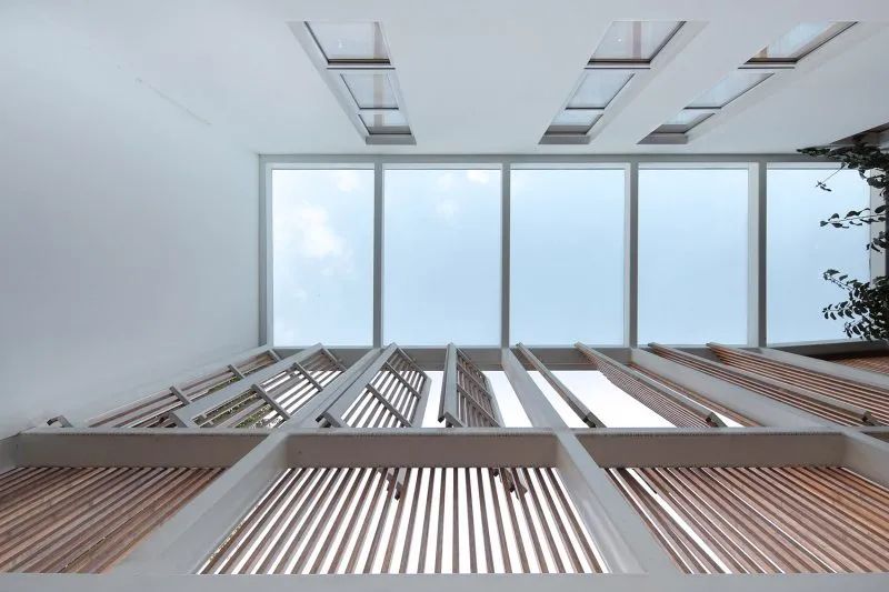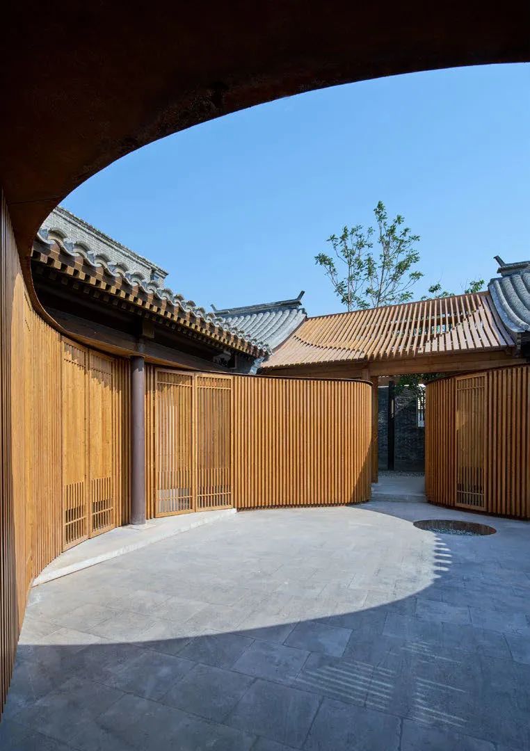 屋頂用原先木架尺寸的竹鋼梁架搭接,椽子采用十字交叉竹鋼構(gòu)件組合,在小院的正上方勾勒出葫蘆形的輪廓,通透的竹鋼板屋面一方面呼應(yīng)了原有屋瓦的尺度,又形成屋面中間更為通透的效果,給屋中小院引入充足的陽光,便于樹木生長。
