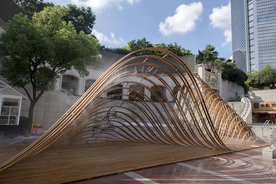 為了達到更輕薄的形體效果,建筑主體采用竹鋼搭建,豎向的立柱每根都為承重住,從而達到均勻受力的效果。“柱”與“梁”的連接部分采用簡單的交錯堆疊起來進行構(gòu)造的方法,使其在形式上產(chǎn)生出類似斗拱結(jié)構(gòu)的效果。