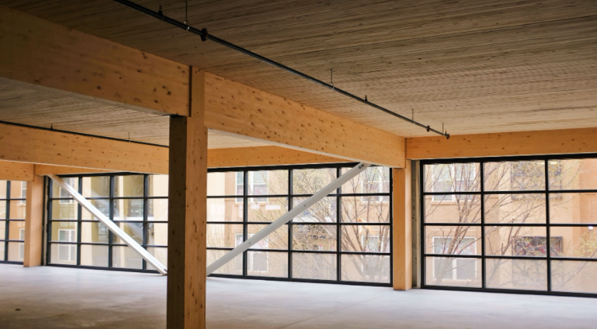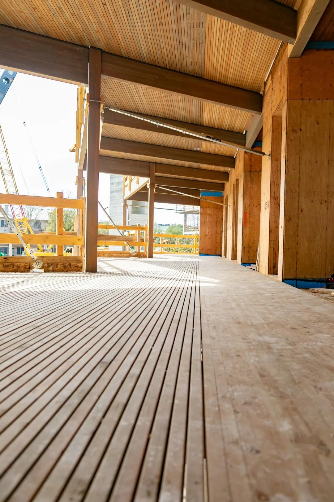 StructureCraft 在木材和材料工程方面擁有非常專業(yè)的知識,結(jié)構(gòu)工程團(tuán)隊(duì)將內(nèi)部 SPF 、DLT 面板用到木質(zhì)走道的設(shè)計(jì)中,膠合木梁柱支撐了樓板。