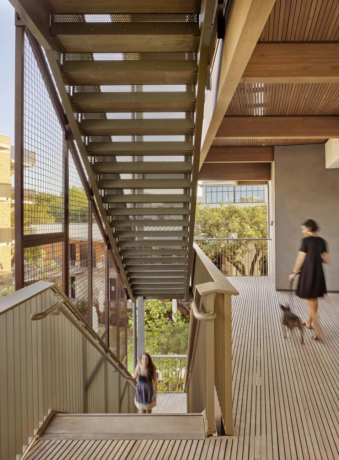 除此之外,還有其他幾處使用了定制的木結(jié)構(gòu)建筑構(gòu)件,其中包括 DLT 電梯和樓梯井、懸掛式陽臺、樓梯以及入口處的獨(dú)立門廊。
