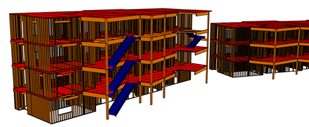 考慮到這些建筑物的墻體、形狀和輪廓都很復(fù)雜。設(shè)計(jì)時對每一面墻都進(jìn)行了建模,并將它們預(yù)制化,以便后期快速安裝。團(tuán)隊(duì)在電梯和出口樓梯處還使用了 DLT 豎井壁,這樣可以實(shí)現(xiàn)極快的安裝,同時還可以顯露木材。