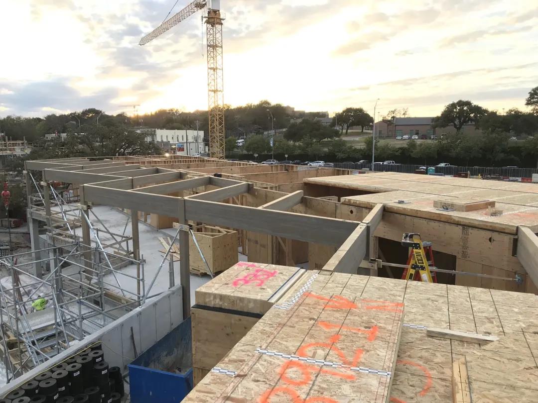 聲學(xué)設(shè)計(jì)也是早期設(shè)計(jì)階段的一個關(guān)鍵考慮因素。為了滿足 STC/IIC 等級,在 DLT 面板上放置了隔音墊以及鋪設(shè)了3 英寸的混凝土層。為了打造良好的居住環(huán)境,設(shè)計(jì)團(tuán)隊(duì)為了減少側(cè)翼噪音,在立柱墻內(nèi)安裝了隔音條。