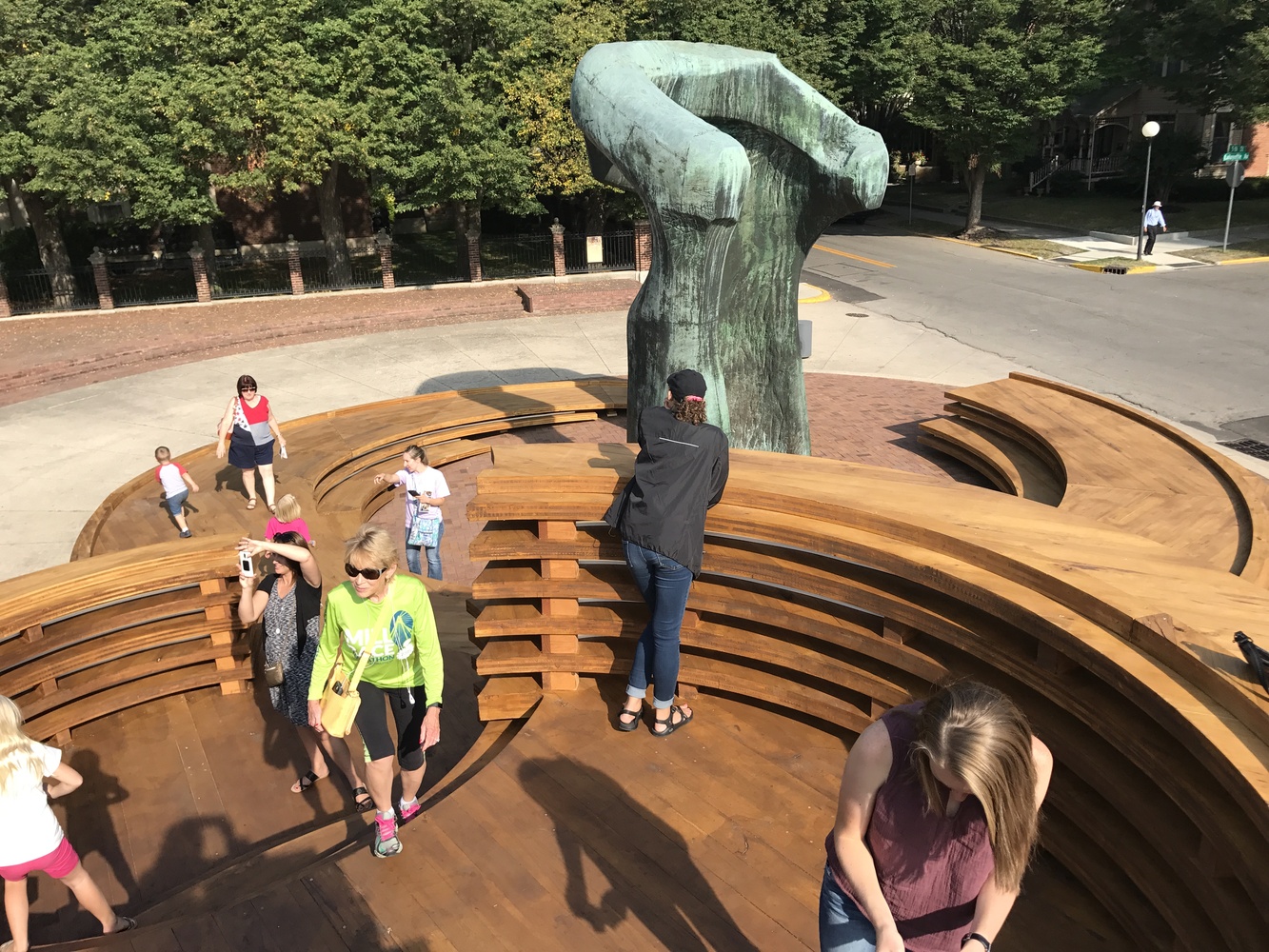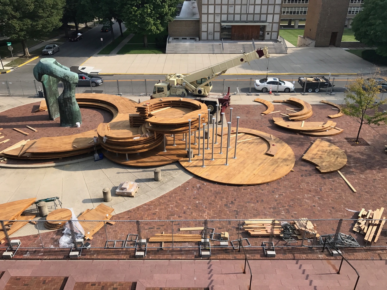 該設(shè)施為社區(qū)提供了一個(gè)不管從字面上還是隱喻上來看,都聚集,交流并且振奮人心的地方。從位于東半部的摩爾雕塑周邊開始,大型木材轉(zhuǎn)盤組成了一系列向西上升的底座。