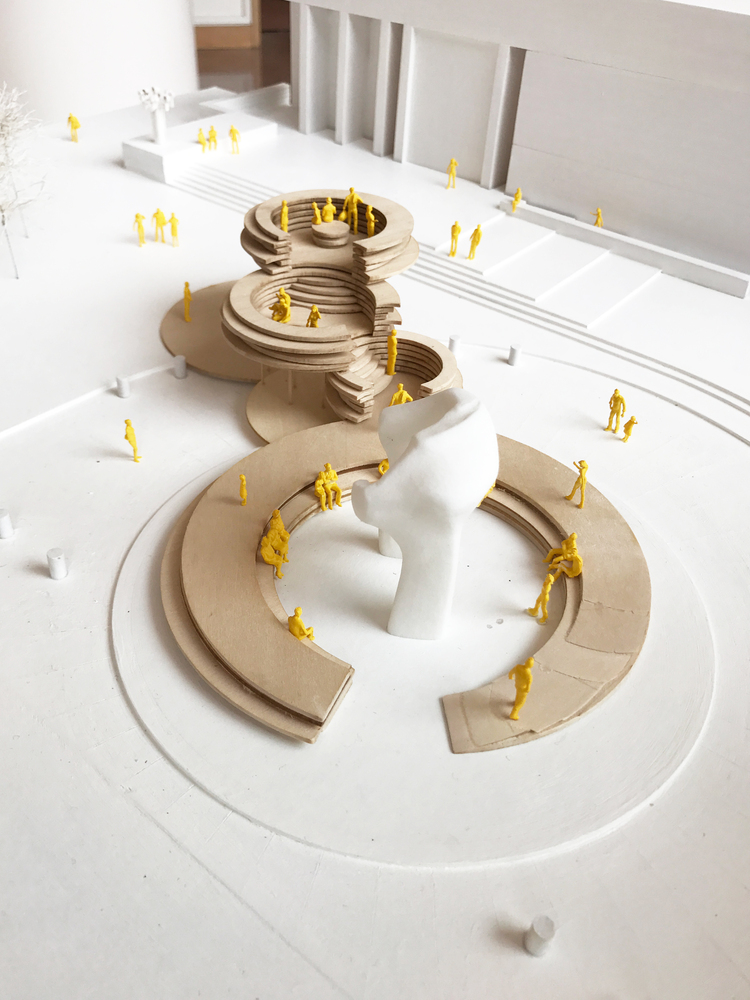 通過跨越現(xiàn)在已經(jīng)不復(fù)存在的旋轉(zhuǎn)狀態(tài),占領(lǐng)現(xiàn)在是一片空白的廣場區(qū)域,該設(shè)施的宗旨在于恢復(fù)場地的空間功能,鼓勵(lì)雕塑周圍的動(dòng)態(tài)流通,并使人們以新的方式從水平和垂直兩個(gè)方向體驗(yàn)這個(gè)廣場。
