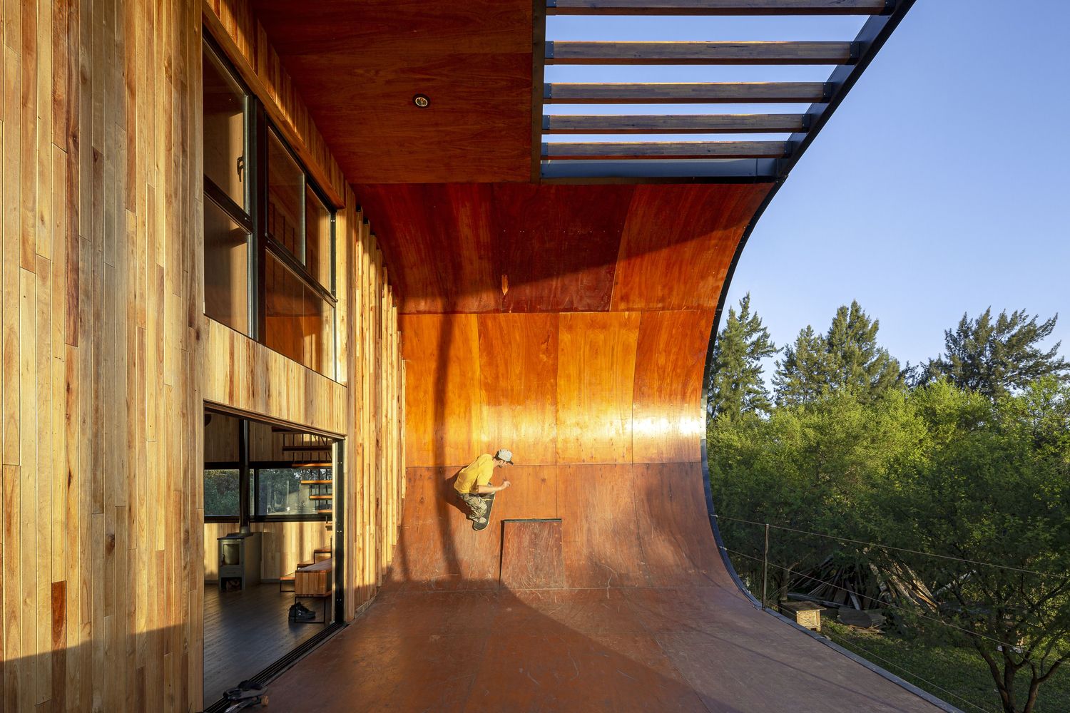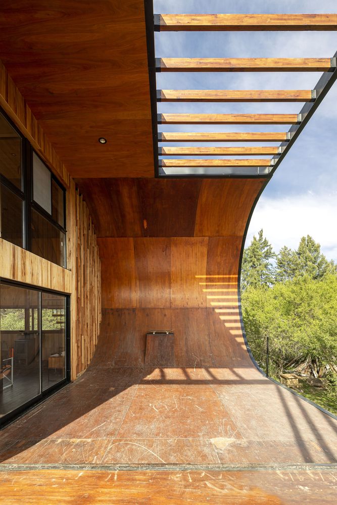 這是一個(gè)100%可持續(xù)的住宅,同時(shí)業(yè)主也可以在上面滑滑板。業(yè)主是一名滑板者,希望房子本身附帶一個(gè)滑板場(chǎng)地。設(shè)計(jì)師將室外陽臺(tái)設(shè)計(jì)成滑道,并在向南一側(cè)設(shè)置一面墻,在住宅東南角形成一個(gè)向上的弧形用于減速。這面墻延伸到了屋檐處,起到阻擋夏天烈日的作用。