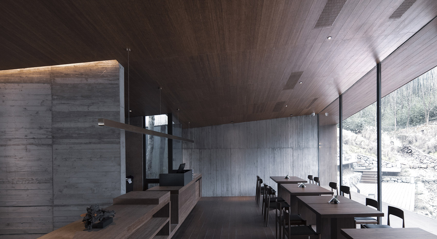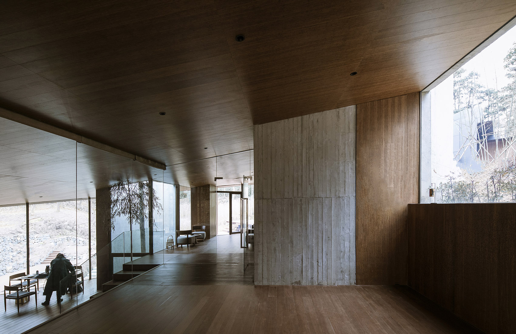 建筑的另外兩側(cè)分別嵌入山體之中,架空的蝶狀建筑的下方仍然保留了溪水和山路的通道。為了將部分樹(shù)木保留在室內(nèi),豎向結(jié)構(gòu)被設(shè)計(jì)成“柱院”,結(jié)構(gòu)意義上是柱子,空間意義上,是保留了一棵樹(shù)的“微院”。屋面是一個(gè)臺(tái)階狀的坡屋頂,可作為小型演出的森林劇場(chǎng),室內(nèi)空間被這個(gè)大坡屋頂統(tǒng)一起來(lái),并因?yàn)椴煌孛鏄?biāo)高的變化而富有節(jié)奏。