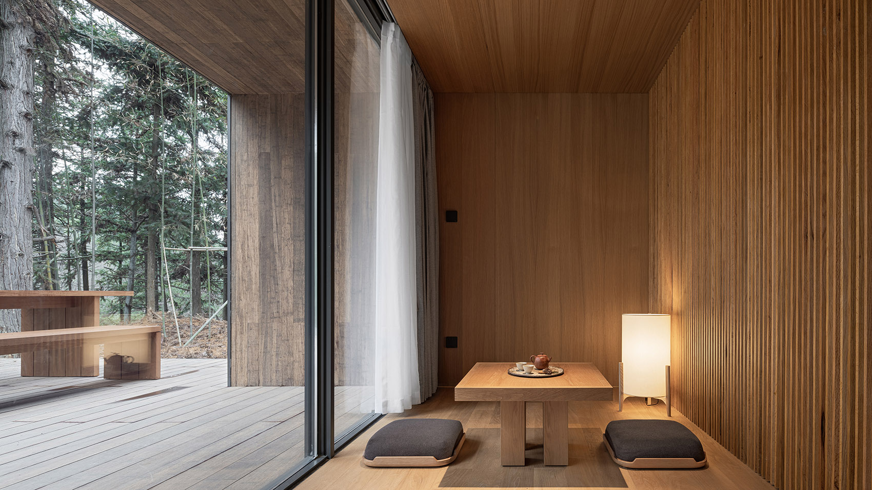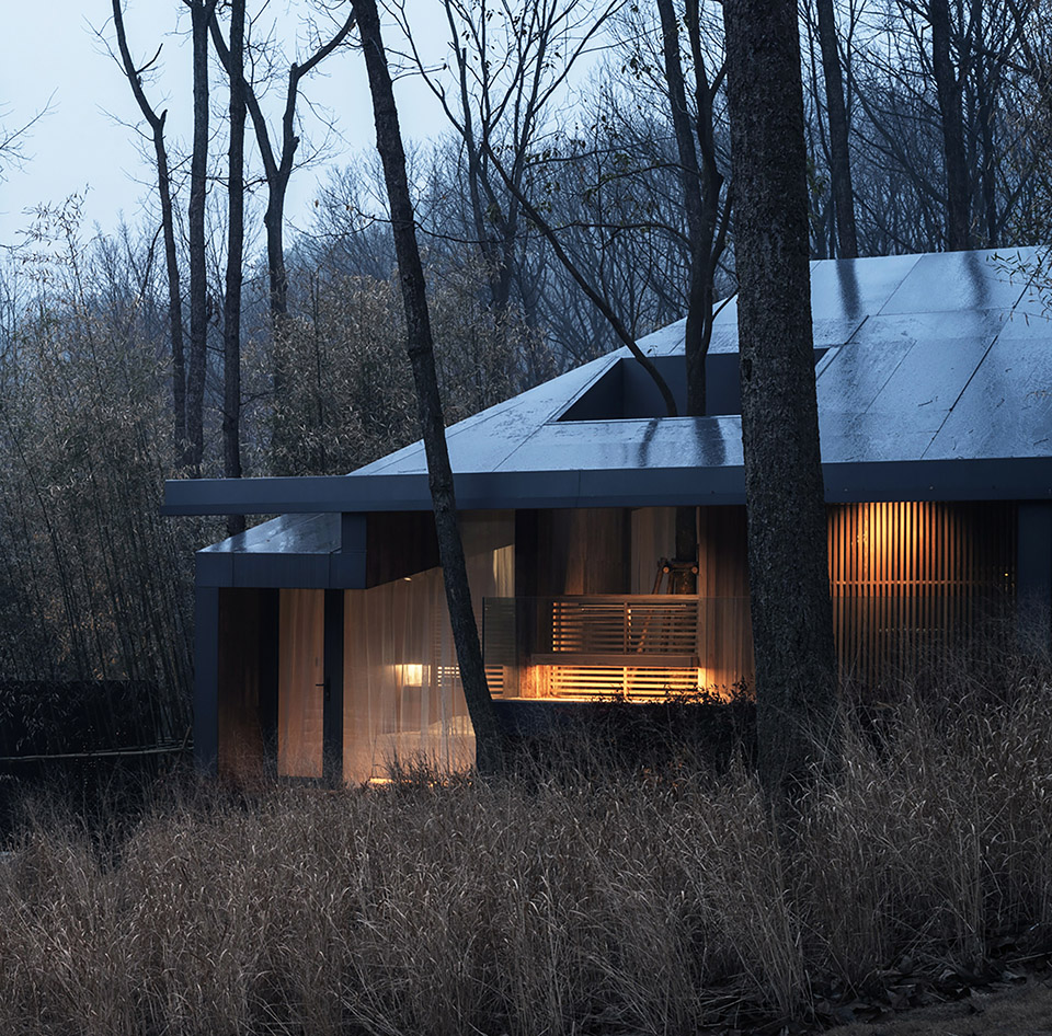 每個(gè)小屋中都保留了一棵場(chǎng)地原生的樹(shù)木,樹(shù)木所占據(jù)的空間成了屋中院,透過(guò)玻璃時(shí)刻于室內(nèi)生活相伴,是自然向建筑的反向滲透,屋中院也為室內(nèi)衛(wèi)生間提供了具有私密性的風(fēng)景。