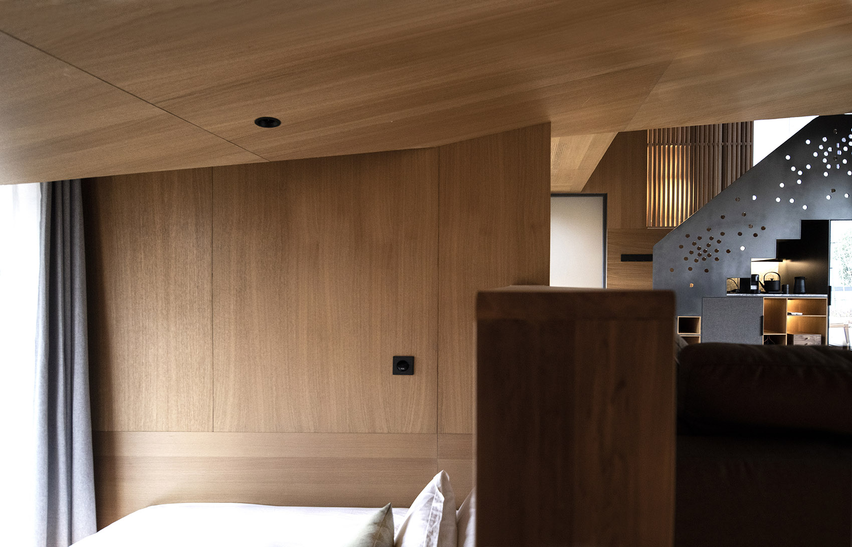 空間的大小是以人的基本尺度來(lái)定義的,建筑的墻面和屋頂都觸手可及,這種微小的尺度讓人時(shí)刻感受到建筑處于自然之中。這種接近于野營(yíng)帳篷的空間體驗(yàn),希望讓人時(shí)刻感受到自然就近在咫尺,只是隔了一層外墻的厚度。通體的木質(zhì)材料提供了溫暖而舒適的建筑內(nèi)襯,給人提供了舒適而愜意的生活氛圍,這和外部自然的野趣形成的強(qiáng)烈的反差,這種反差讓人對(duì)自然保持敏感,更能感受到自然之美,或溫柔細(xì)膩,或爆裂冷峻。
